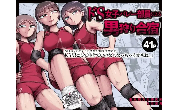 メスはオスに身体能力で劣後するという男たちのベースにある価値観をガチンコの力比べで破壊し、凄惨な暴力によって恐怖で泣かせるのが趣味の女子バレー部の長身部員たち。いつも標的探しで談笑する彼女たちが本命視して待ち焦がれたのは、女子バレー部の男性監督と男子マネージャーを田舎の隔離施設で思う存分ボコれる夏合宿の日。わけもわからず監禁されて憤慨する男たちに対し、失神ゲームで恐怖を植え付けた挙句、トゲ付きの戒めの輪っかを陰茎の根本に装着。